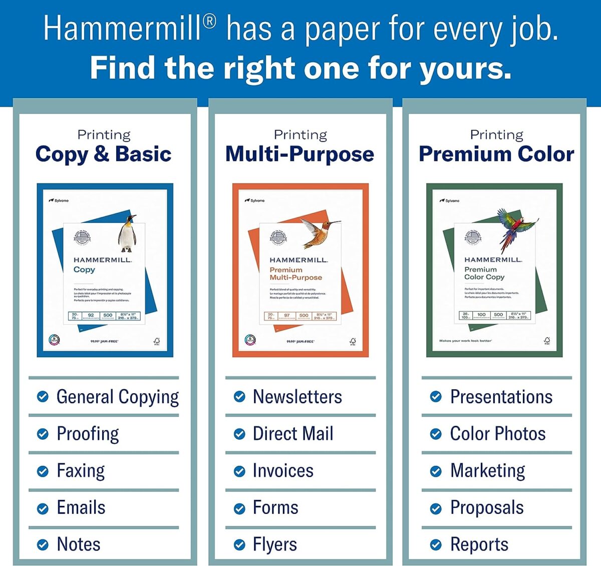 • OTHER PAPER OPTIONS: Scroll down to compare Hammermill print and copy paper for every purpose, including premium presentation-quality color copy paper, cover-weight paper stock, and glossy paper for photo printing