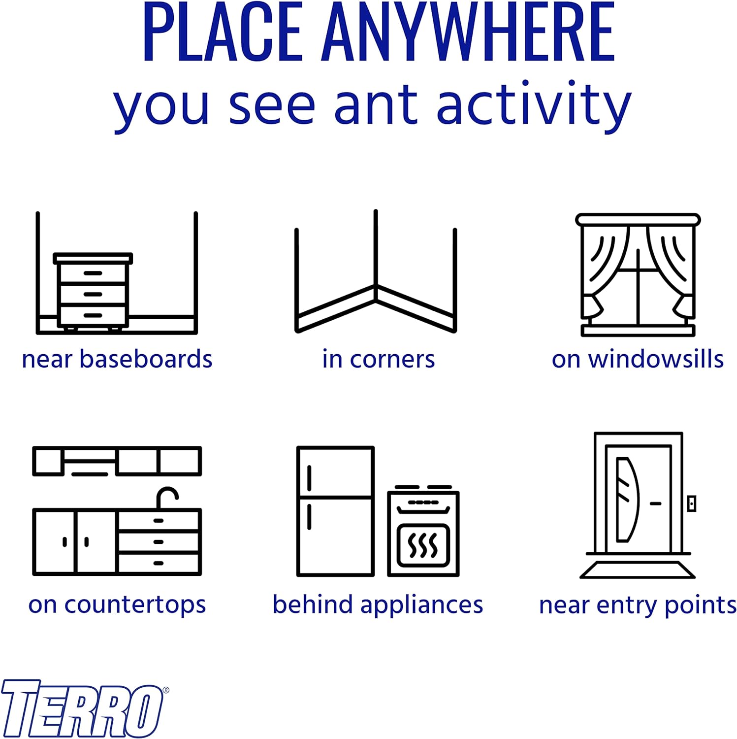 - Use Throughout Your Home – Place stations near areas where you’ve seen ant activity including along baseboards, in corners, on counters, and more